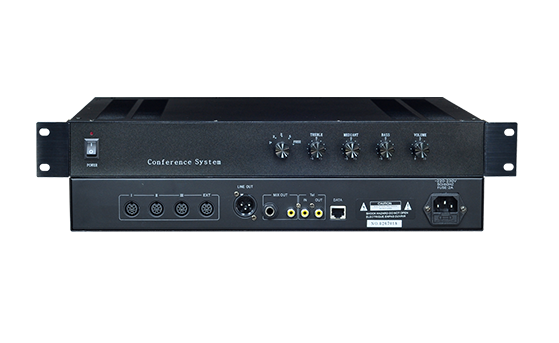 本主机为纯发言会议系统主机,具有高保真、高还原度等特点,主机具有四组8P-DIN插座用于系统多路连接,每路最多可以控制35套列席单元,常规产品可以联接60套会议系统列席单元,附加扩容设备可增至联接150套以上的列席单元